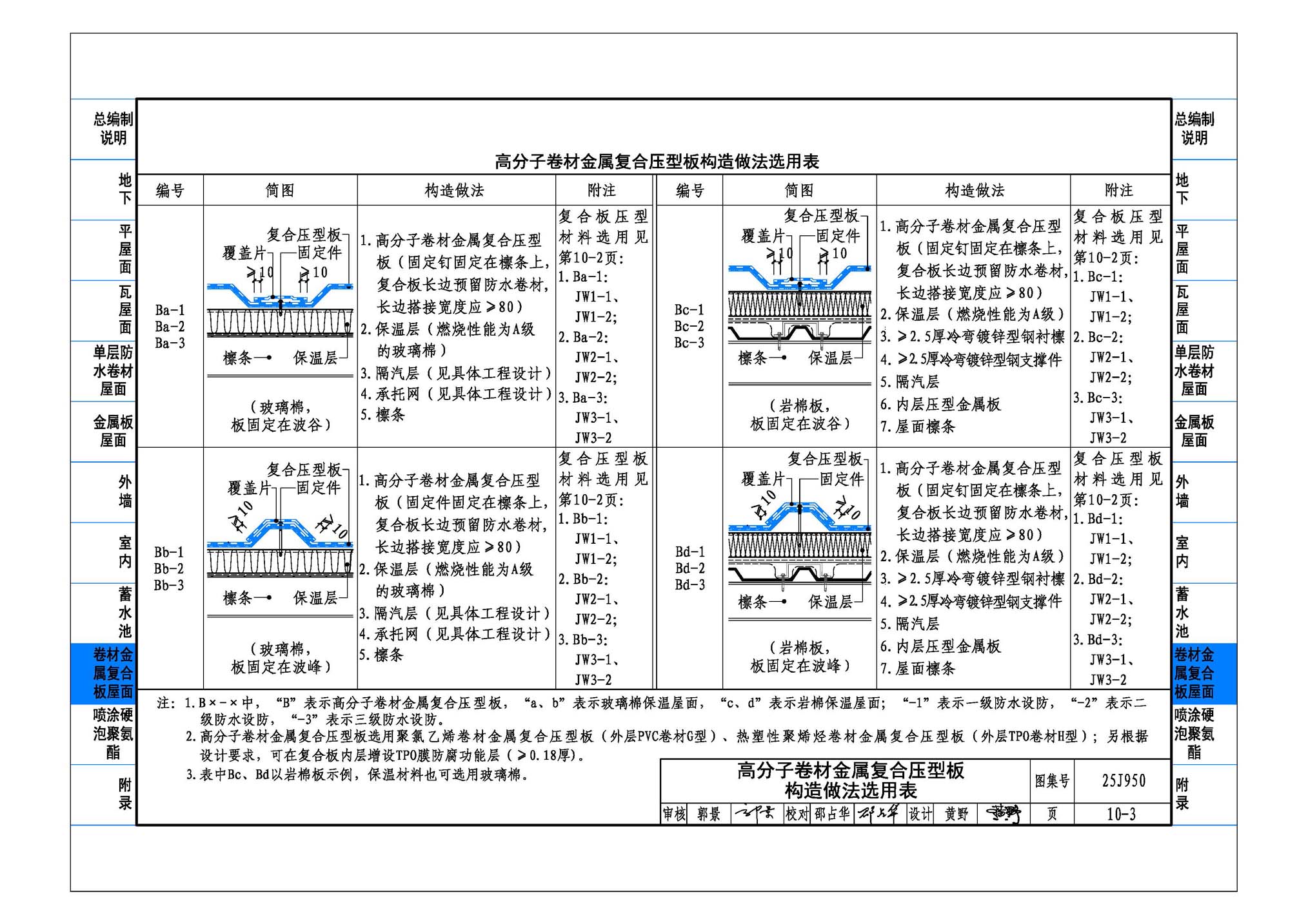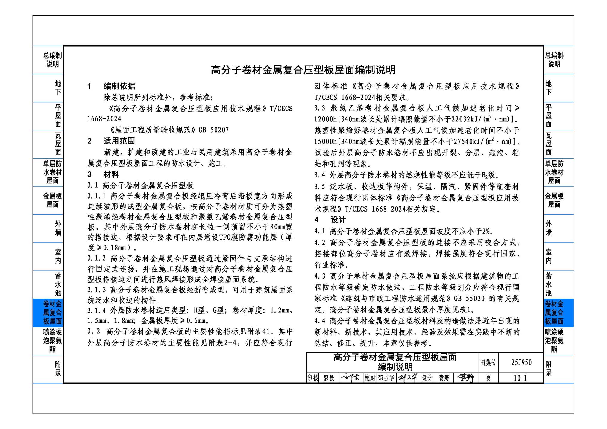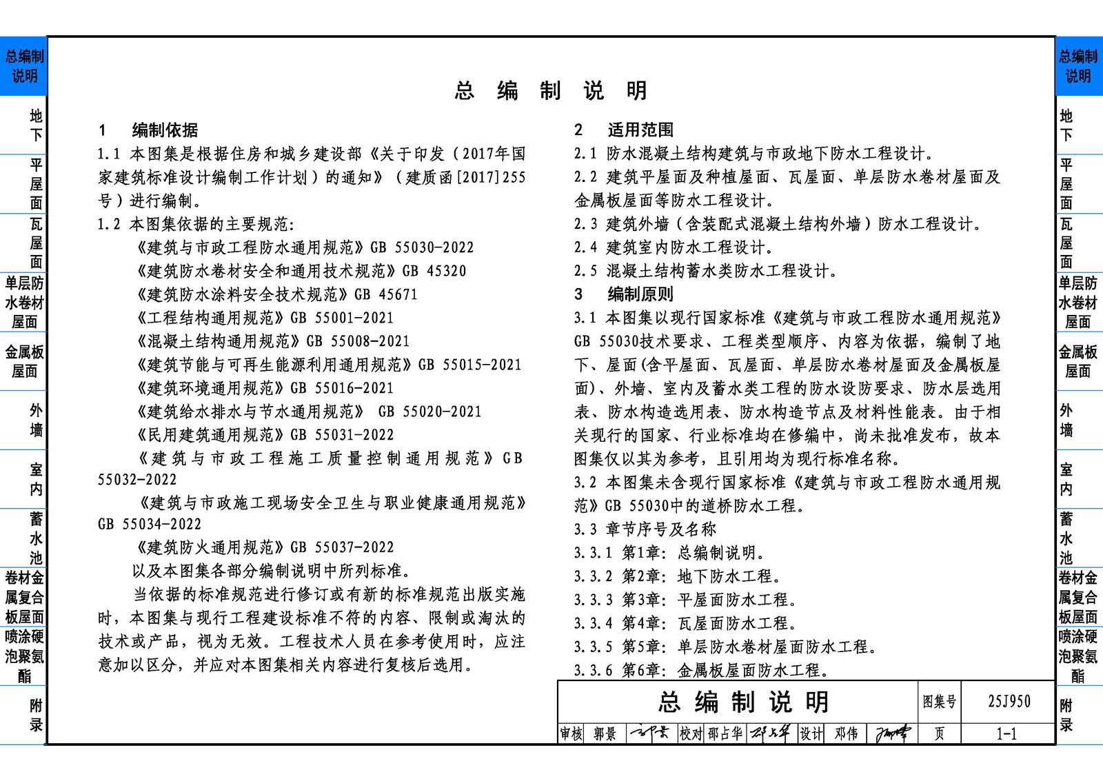 图集依据工程建设强制性国家规范《建筑与市政工程防水通用规范》GB 55030-2022编制,适用于建筑与地下市政工程的防水设计。主要包括建筑与市政地下工程,建筑平屋面、瓦屋面、种植屋面、单层防水卷材屋面、金属板屋面、高分子卷材金属复合压型板屋面、外墙、室内、混凝土蓄水池的防水技术;各部位适宜的常用防水材料主要性能及防水构造选用表,设计、施工、验收技术要点及常用、典型防水构造详图;供设计、施工、验收、监理选用或参考。