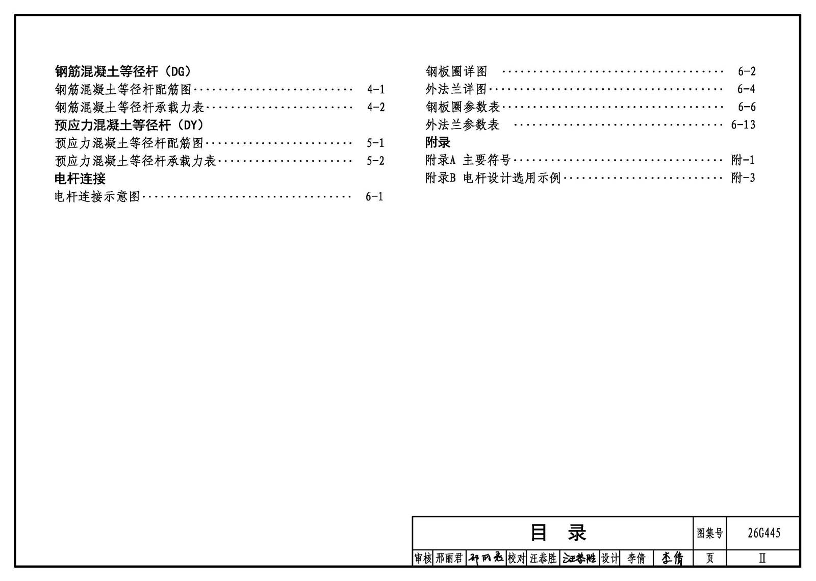26G445《环形混凝土电杆》国家建筑标准设计图集是新编图集,依据《混凝土结构通用规范》、《混凝土结构设计标准》、《环形截面混凝土电杆结构设计规程》和《环形混凝土电杆》等标准,为方便设计、施工、生产人员使用,按统一、简化、优化原则完成编。