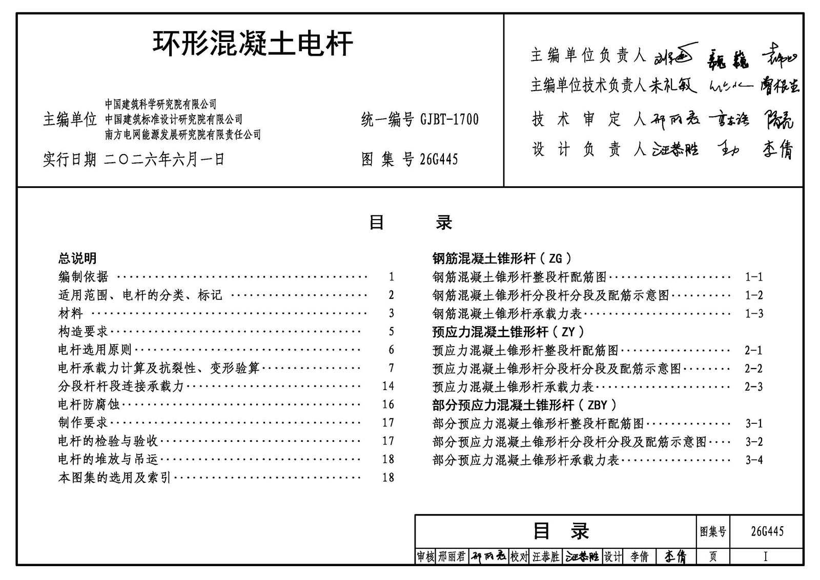 26G445《环形混凝土电杆》国家建筑标准设计图集是新编图集,依据《混凝土结构通用规范》、《混凝土结构设计标准》、《环形截面混凝土电杆结构设计规程》和《环形混凝土电杆》等标准,为方便设计、施工、生产人员使用,按统一、简化、优化原则完成编。